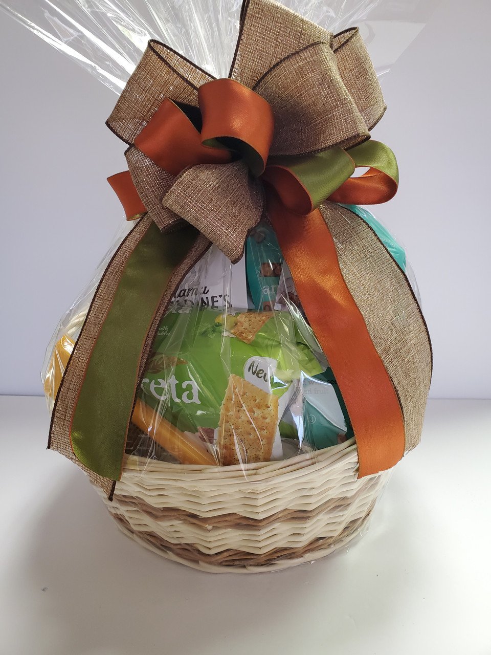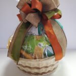 This fall harvest gift basket is filled with sweet and savory snacks to nibble on during the brisk fall weather. Assorted cookies, chocolates, cheeses, crackers, nuts, trail mix, granola.pretzels. A little of everything for everyone to enjoy together.