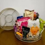 This beautiful silver metal 4 section tray with gold beads is filled with the finest gourmet treats. A little of everything for everyone to enjoy