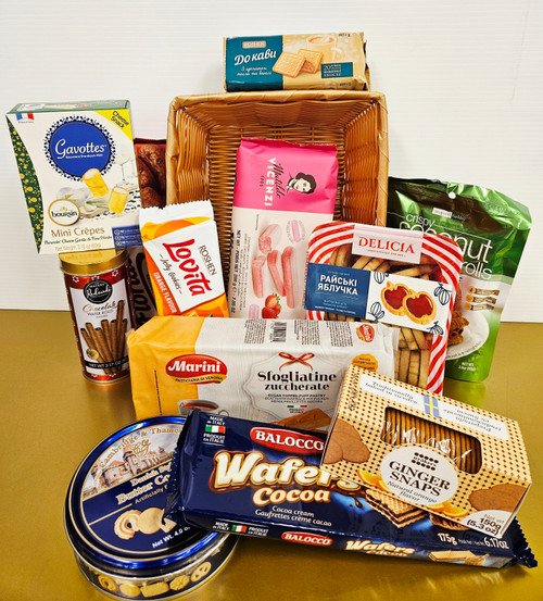 This unique gift is created in wicker basket topped with a beautiful poinsettia handmade bow . We have filled it with a variety of delicious cookies from around the world like France * Italy * Switzerland * Ukraine * Poland * Gavottes French Mini Crepes with Boursin Cheese Swedish Orange Gingersnaps Vicenzovo Strawberry Ladyfingers Cookies (Choco Glazed) Lovita -ORANGE JELLY Cookies FLORIDA w/CHOCOLATE DROPS Cookies PARADISE APPLES chocolate wafers Cookies Puff Pastry SUGAR MARINI SAVOIARDI Cookies DO KAVA w/BUTTER VANILLA coconut rolls danish style butter cookies