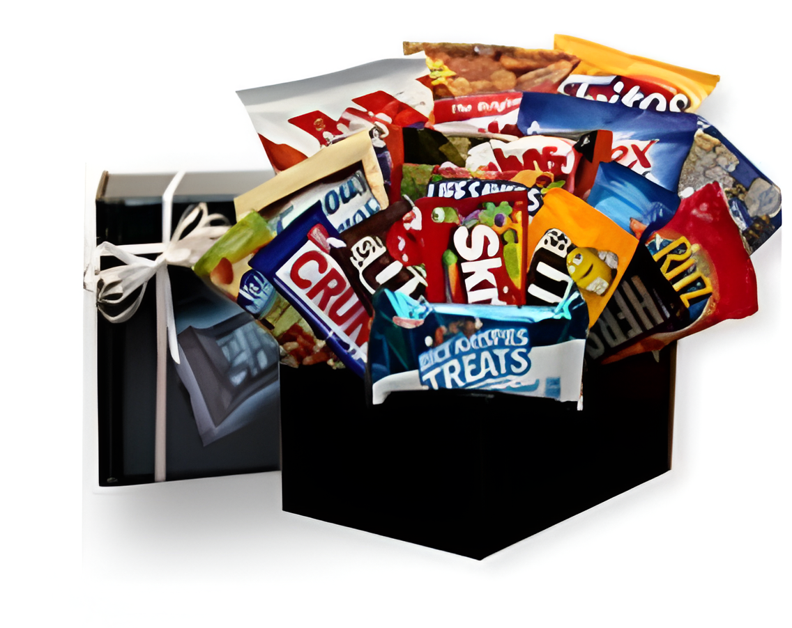 What hardworking student, overworked colleague or sick friend wouldn’t love receiving this Sampler of snacks? Filled with everyone’s all time favorite treats like Fritos corn chips, Planters peanuts, Famous Amos chocolate chunk cookies, Plain and Peanut M & M’s candies and more. Packed in a Midnight Munchies gift box and topped with a handmade bow this gift is the perfect pick me up. The Midnight Munchies Gift Pack includes: Fritos corn chips, Chex mix, Cracker Jacks with peanuts caramel corn, TGI Fridays potato skins chips, Famous Amos chocolate chip cookies, ACT II microwave buttery popcorn, Ritz cheese filled mini crackers, Combos cheese filled pretzels, Oreo cookies, Lifesavers gummy candies, Blue diamond lime and chili almonds, Nestle crunch milk chocolate candy bar, M & M’s milk chocolate plain candies, M & M’s peanut candies, Skittles fruit candies, Hershey milk chocolate bar, Rice Krispies Treat. Comes packed in a black gift box as a care package with a Midnight Snacks graphic and a hand tied bow. Actual gift box measures 9″ in length by 6″ in width and 5″ tall.